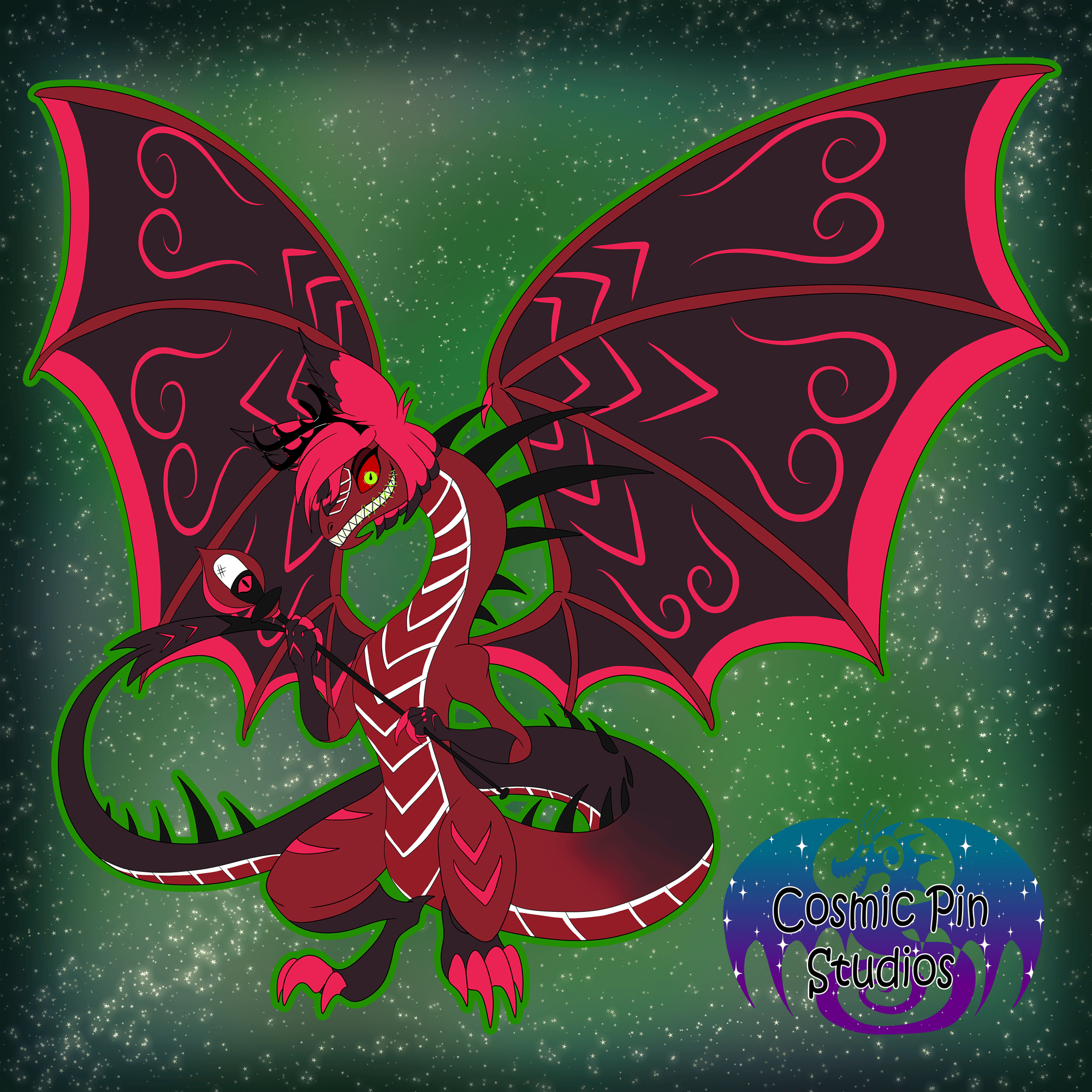 This pin is a 3 inch Dragon Alastor made on Gold metals with UV effects.